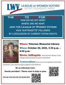 Join members of the League of Women Voters Mt Pleasant Area and other community members for a showing of “Suffragette” and conversation about current voting related topics.